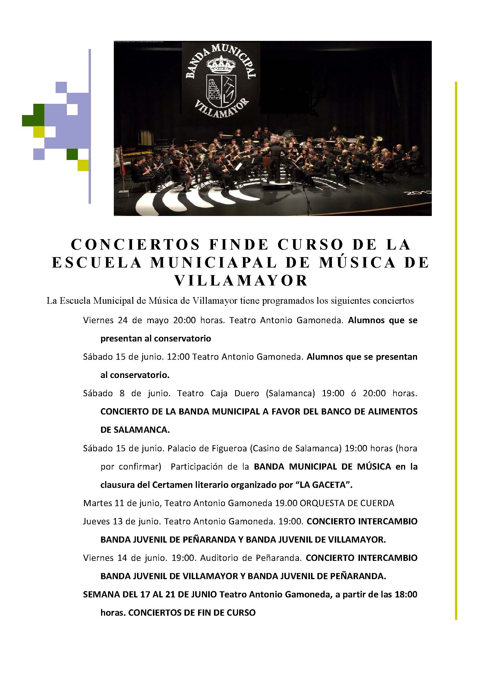 - II Concierto a cargo de los Alumnos que acceden al Conservatorio. Sábado 8 de junio. Teatro Caja Duero (Salamanca) de 19:00 ó 20:00 horas. Actuación de la Banda de Música de Villamayor a favor del Banco de Alimentos de Salamanca.